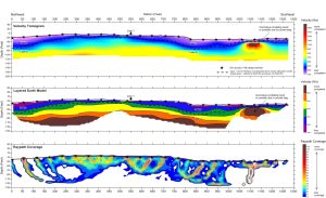 The example above displays a seismic refraction tomography survey conducted over slag heaps at an old smelter site to aid in remediation planning for the area. The upper panel displays the results of the tomographic modeling of seismic velocity; the interface between layer 1 and layer 2 of the more traditional layered earth model result is also shown for comparison. Analysis of the seismic velocity combined with borehole data across the site produced the layered model of rock strength in the middle panel. This has been constrained by the raypath coverage (sensitivity of the model) in the bottom panel.
